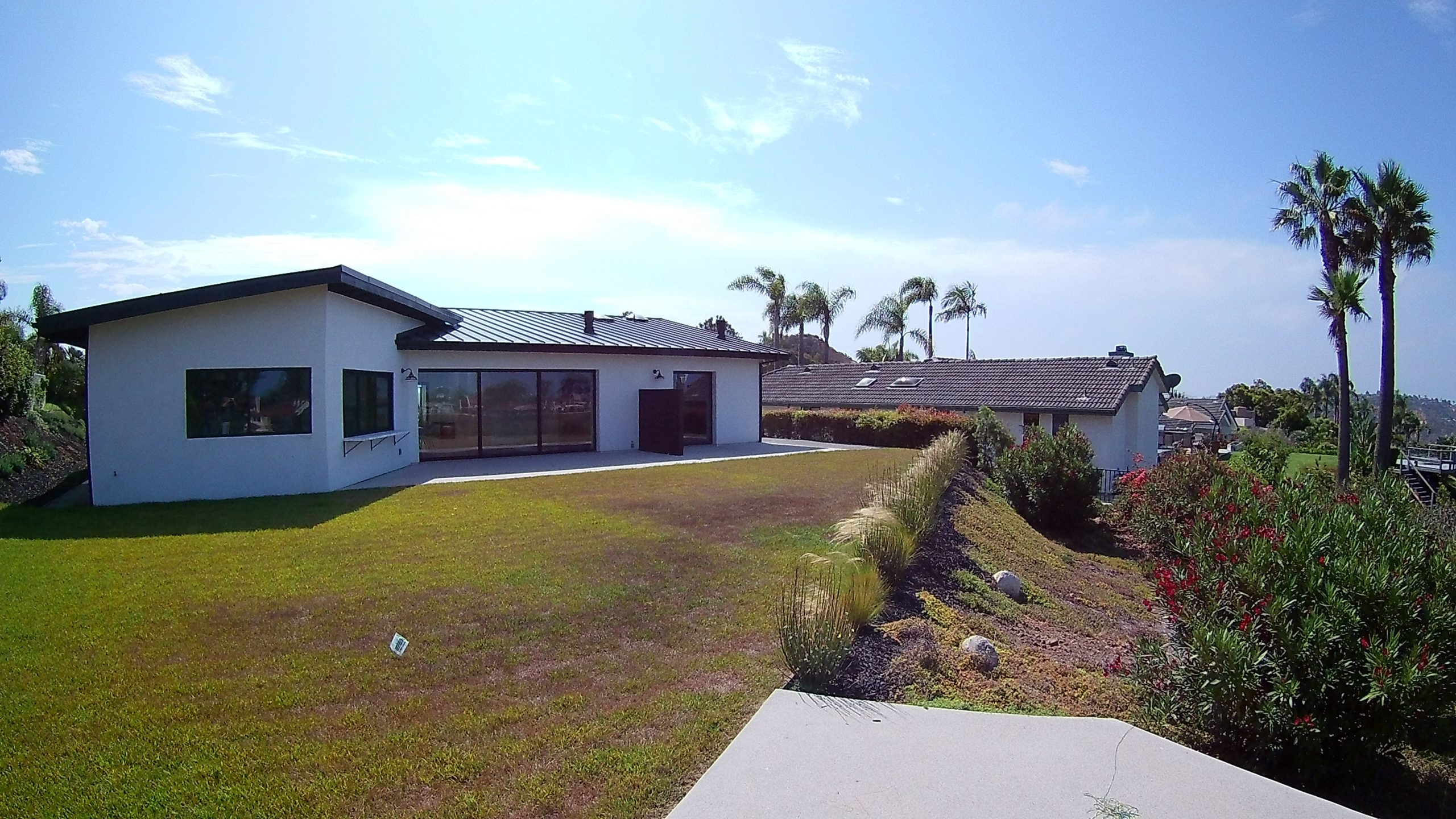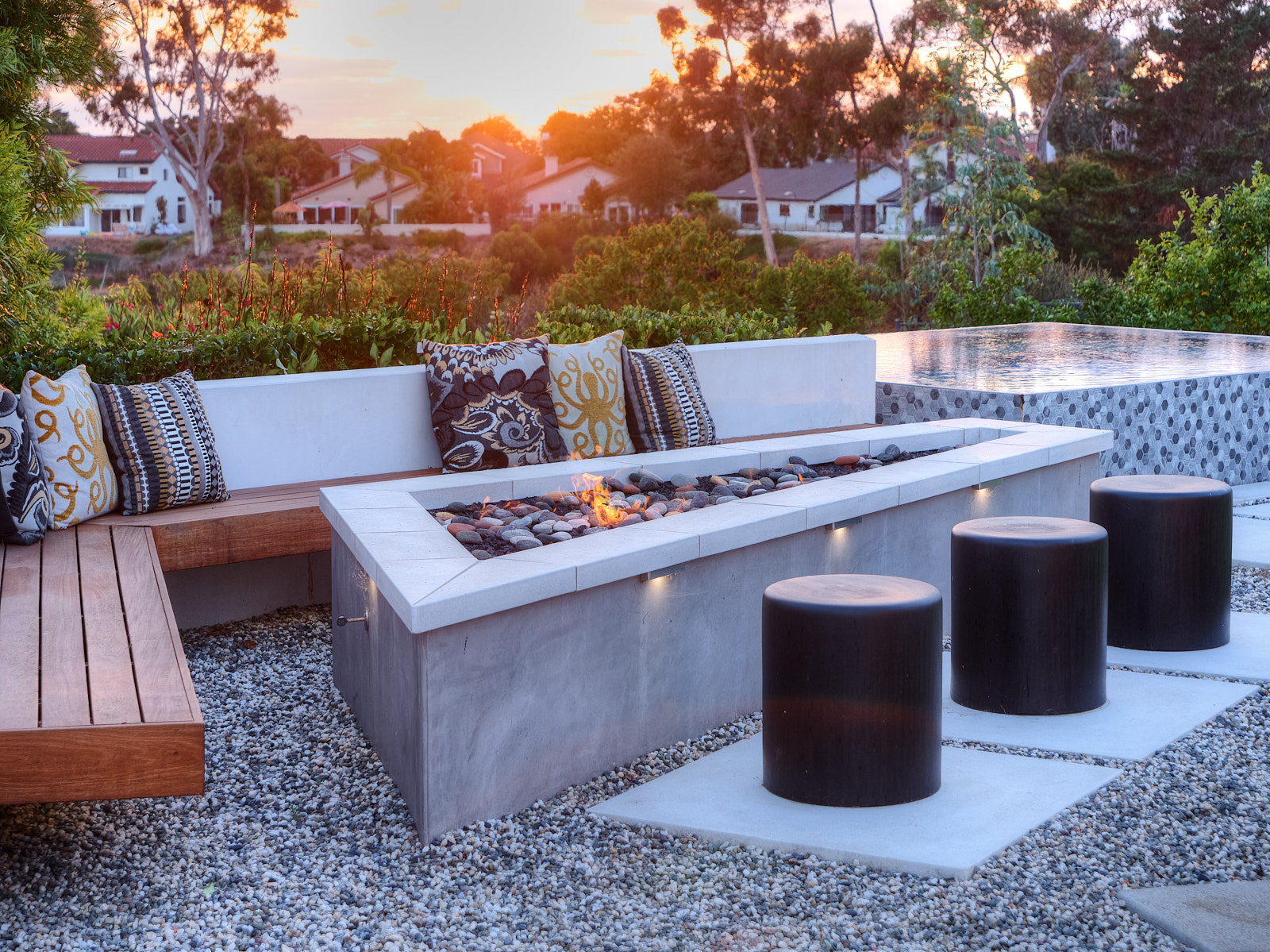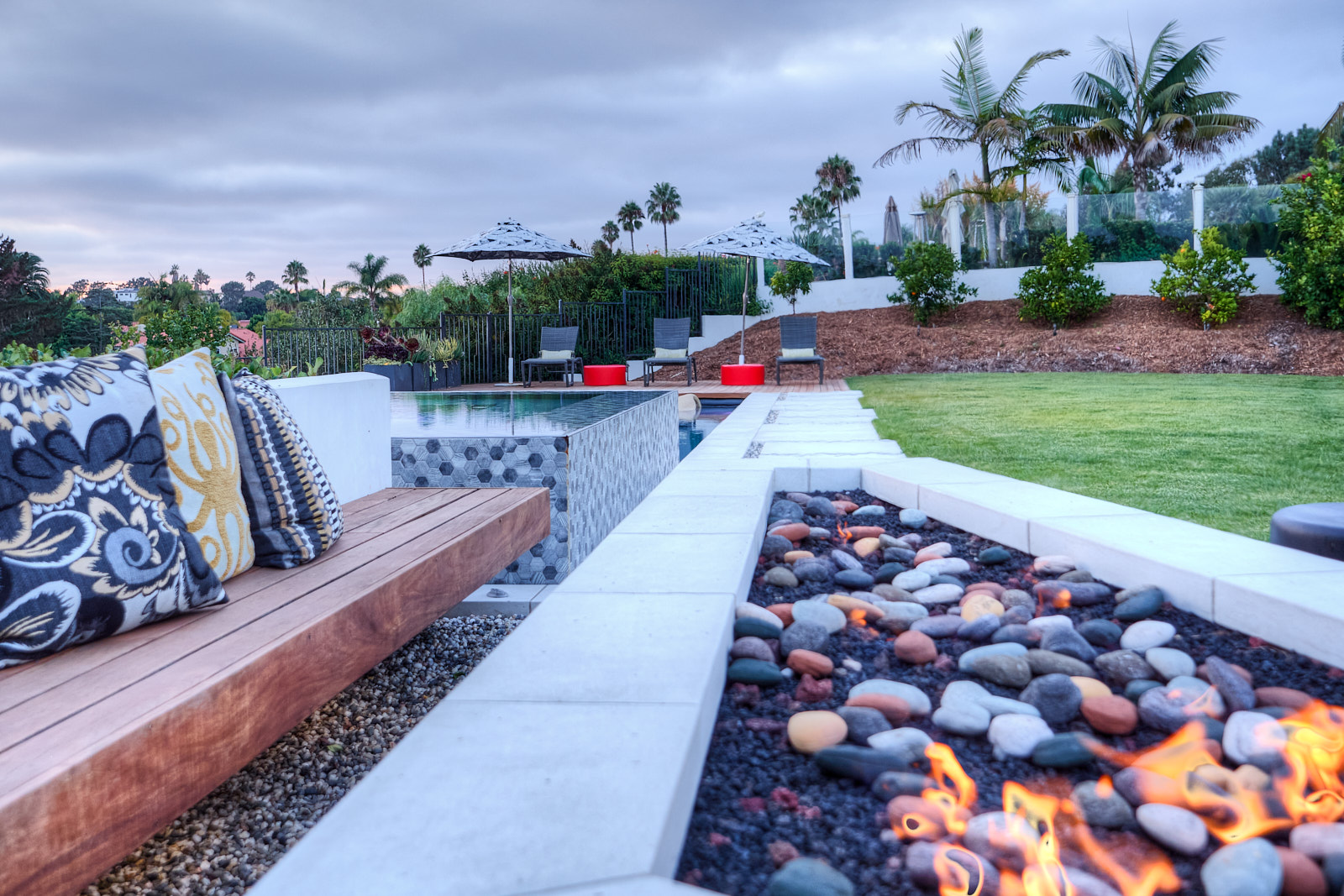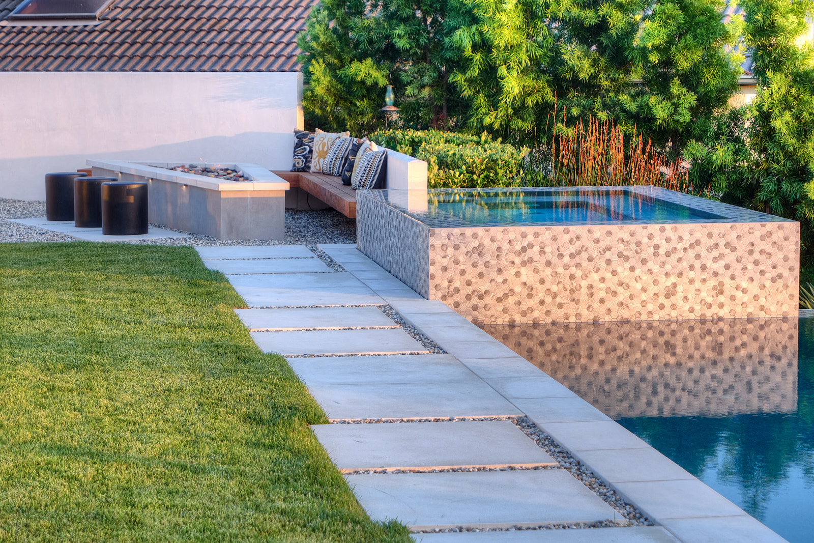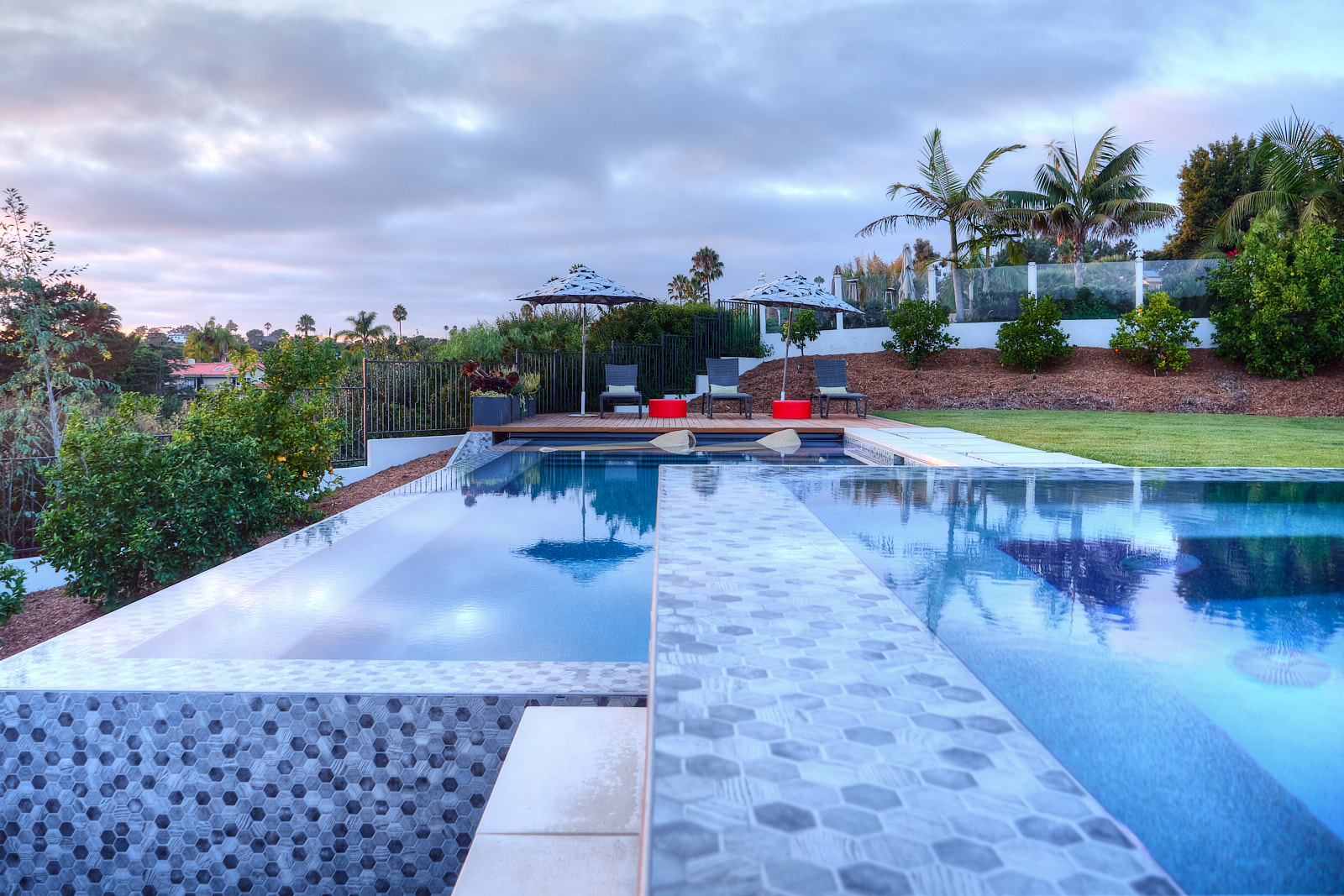 This remodel of both the front and back yard included a new, custom vanishing pool and spa with automatic cover, Ipe decking over pool cover, custom fire pit, PV and water solar panel installation, hardscape, fencing, custom color lighting. The landscaping work included subterranean irrigation for grass area, to make this lawn lush and low maintenance.