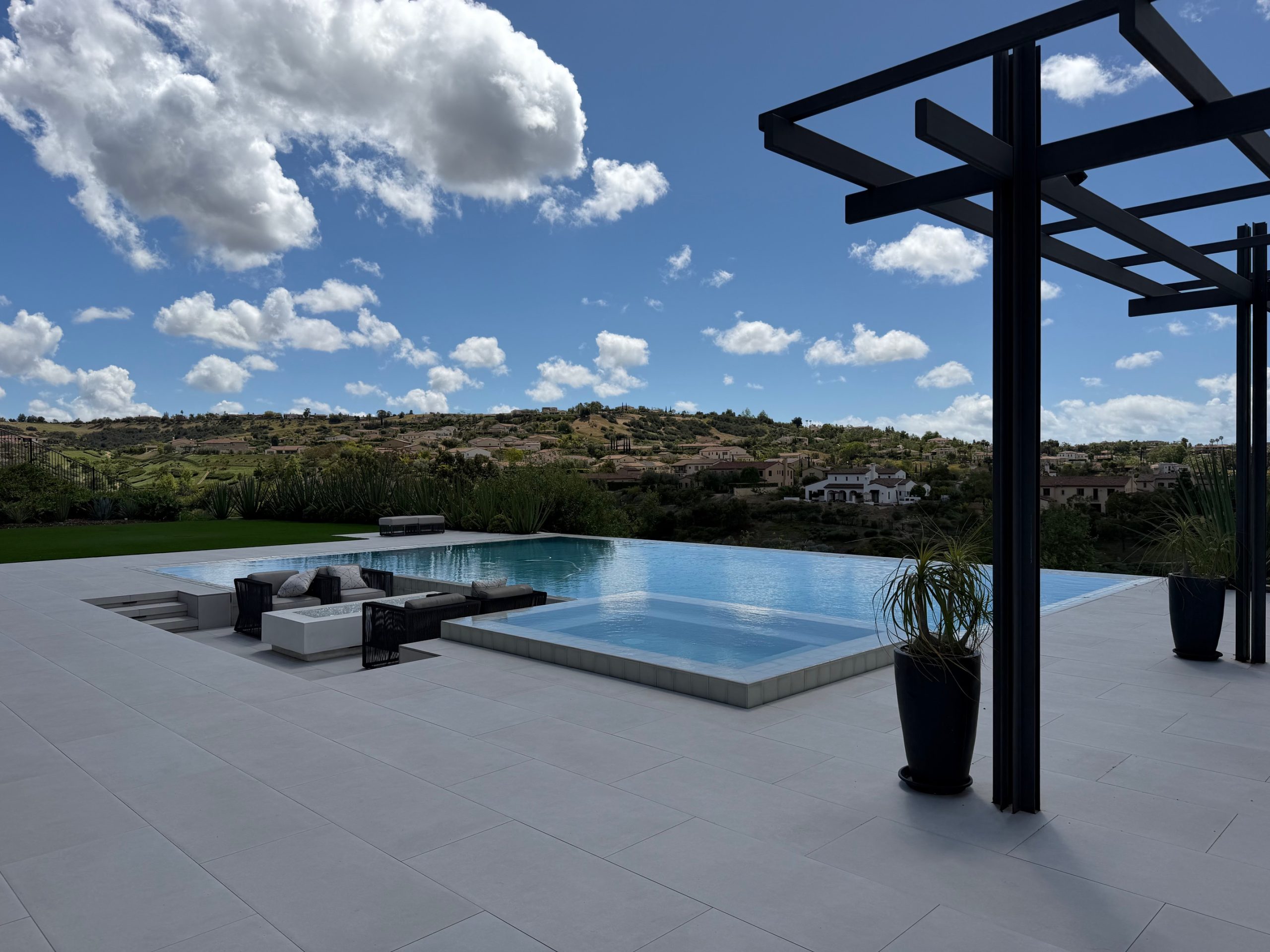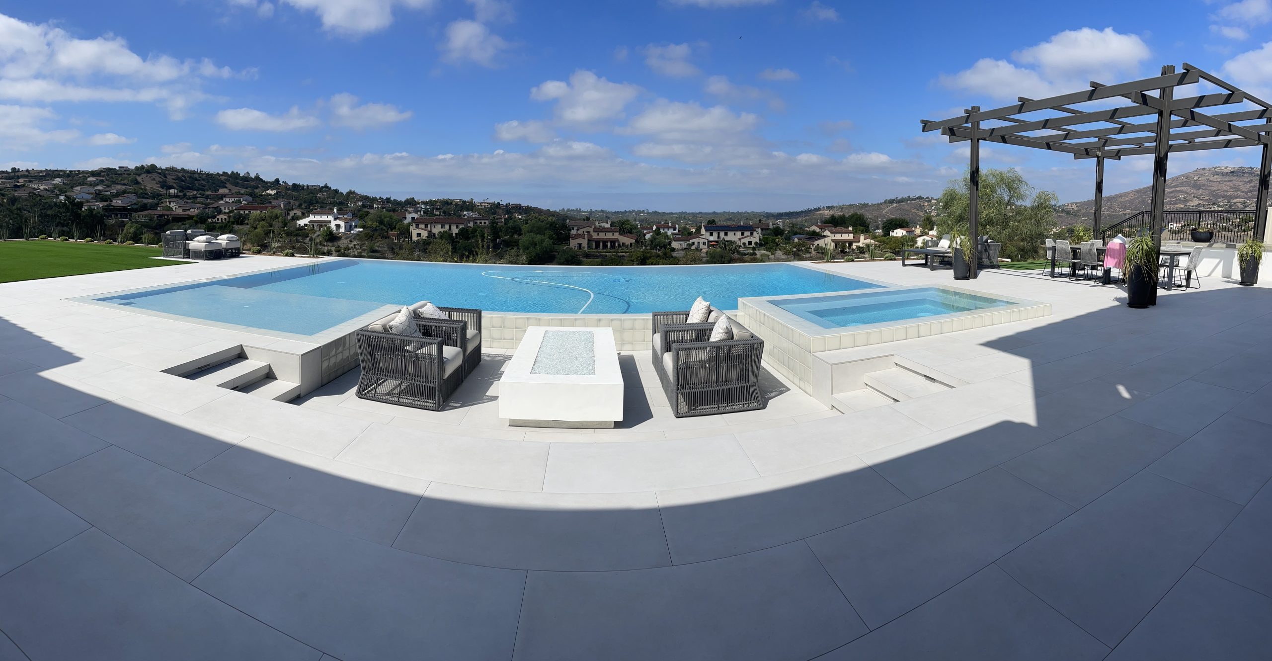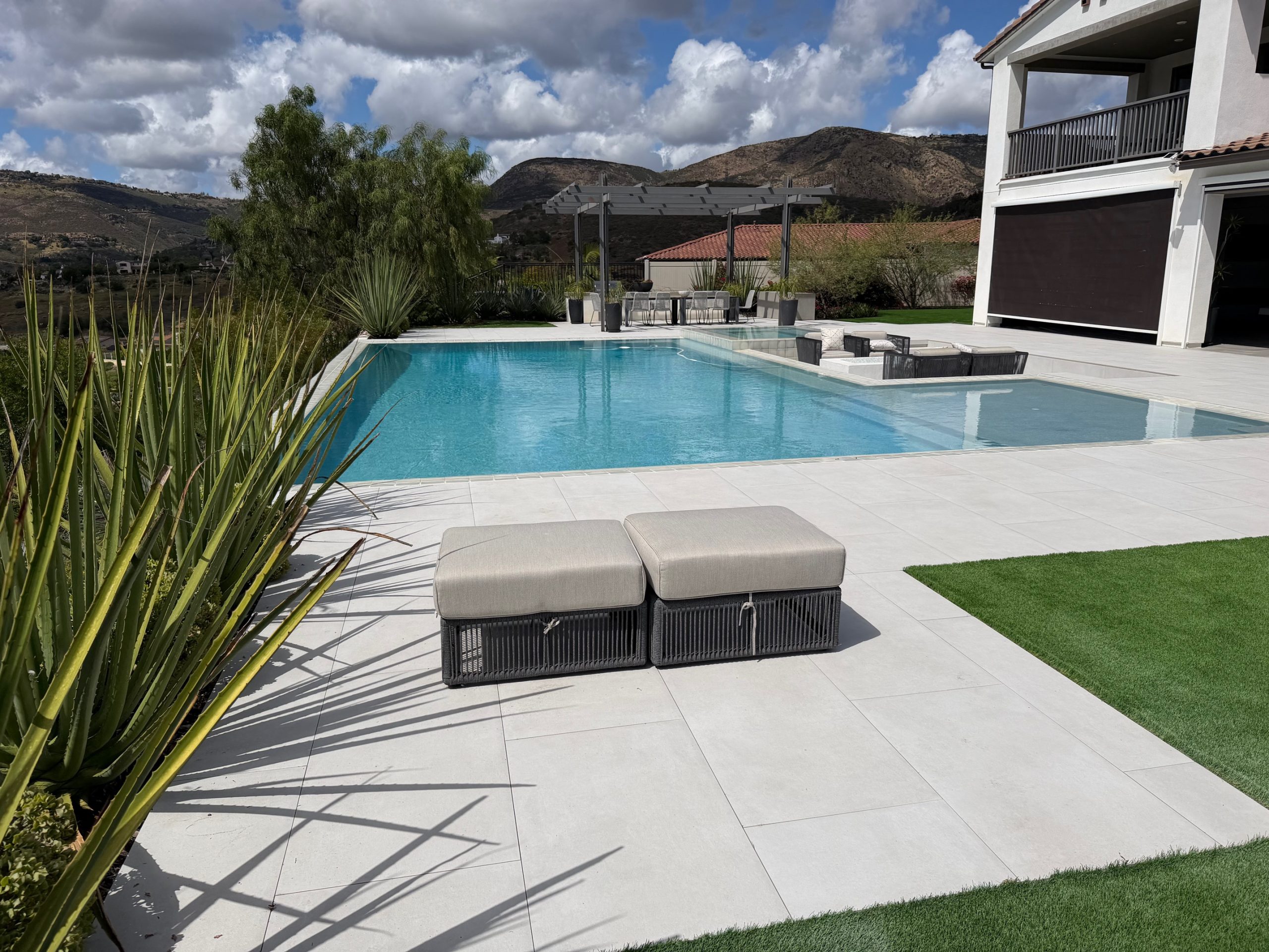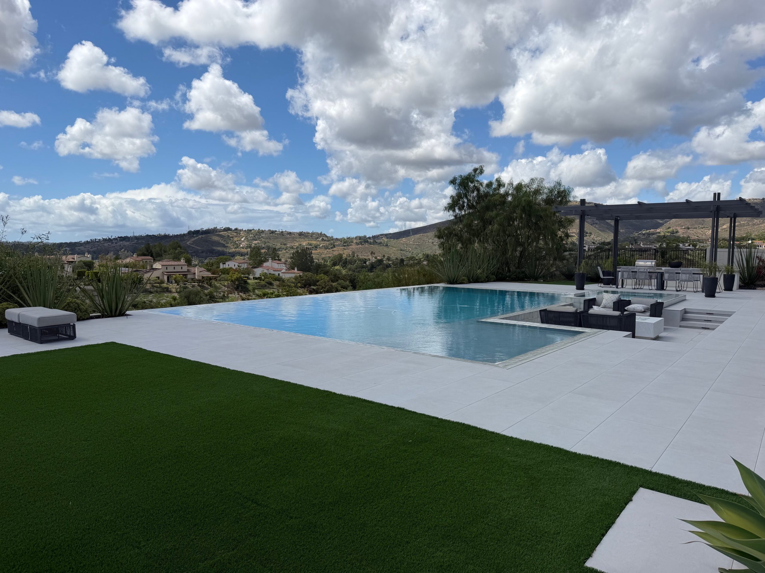 For this backyard, custom pool, and spa remodel, the clients wanted a pool that was unique and impressive. We sunk the fire pit area to avoid any obstruction of the view from the covered patio area. We also created a water feature around the fire pit to tie the space together. We mortar set large format pavers around the pool and on the stairs for a finished and elegant look.